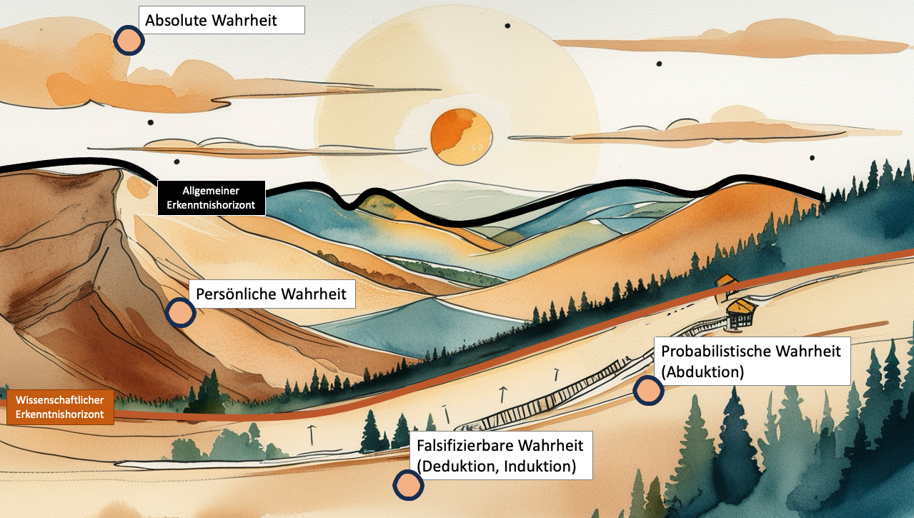 - Absolute Wahrheit: Mit der Grenze der persönlichen Wahrheiten wird der allgemeine Erkenntnishorizont gesteckt. Wir können nicht wissen, was wir nicht wissen. Wir können nicht wissen was wahr ist, wenn es sich unserer Erfahrung entzieht. So können wir nicht Wissen was absolut wahr ist, weil wir weder die Fragen dafür kennen, noch die Antwort. Sehr unterhaltsam können wir darüber sinnieren ob die 42 (Quelle [8]) wirklich eine absolute Wahrheit ist, wir werden es aber nie erfahren.