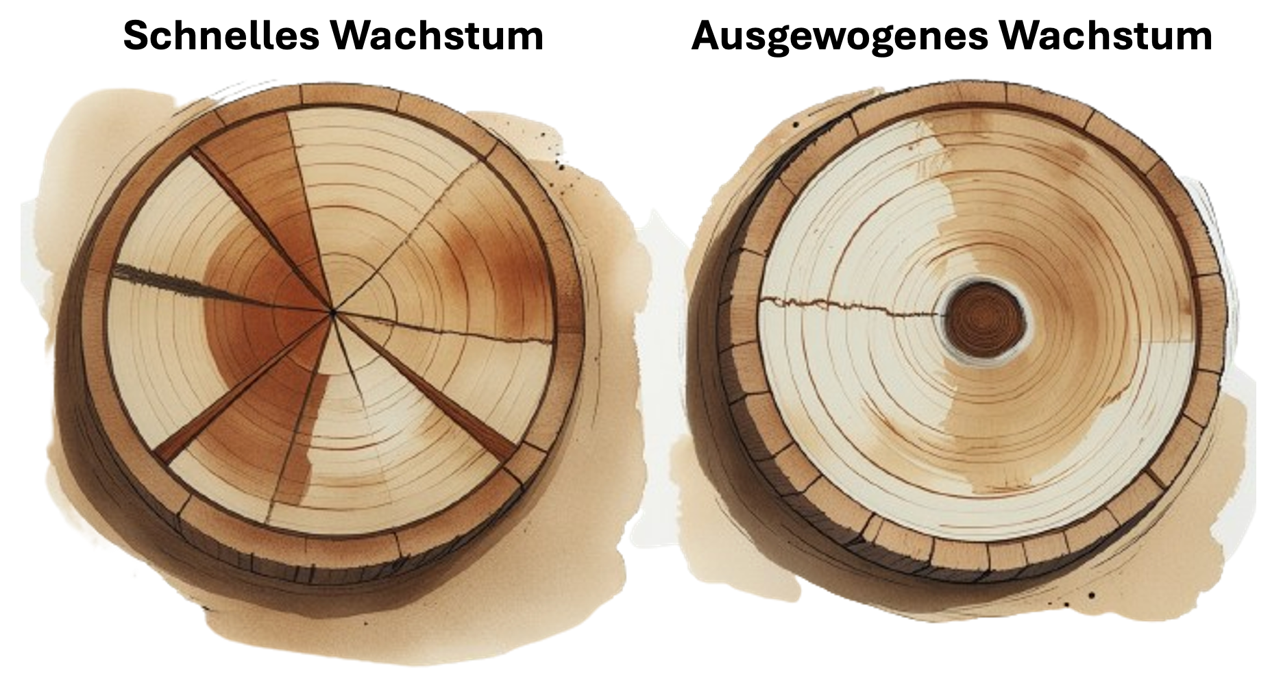 Akio Toyoda nutzte es als Analogie für nachhaltiges Wachstum: Wenn ein Baum zu schnell wächst, entstehen besonders breite Ringe mit größeren, dünnwandigen Zellen, die im Vergleich zu langsam gewachsenem Holz geringere Dichte und mechanische Festigkeit haben – was die Stabilität des Stammes reduziert. Dieses schnell gewachsene Holz zeigt eine geringere strukturelle Festigkeit, wodurch der Stamm leichter verformt oder gebrochen werden kann, besonders unter Belastung wie Wind oder Gewicht. Außerdem erzeugen diese Ringe innere Spannungen und Defekte, die zu Schwachstellen führen, an denen Risse oder Brüche leichter entstehen.